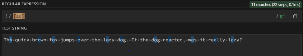 뒤에 g를 붙여야 하고 g는 글로벌을 나타내므로 마지막 문자 이후에도 검색을 멈추지 않습니다. 또한 대문자로 표시된 글자를 포함하려면 i를 추가해야 하지만 이 경우 우리가 찾는 글자는 모두 대문자로 표시되지 않습니다.