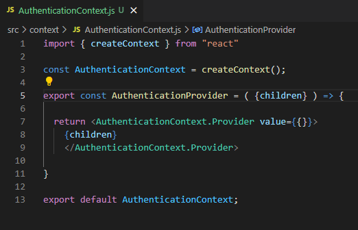 이것을 한 줄 한 줄씩 나누면, 1번째 줄은 단순히 react에서 createContext 함수를 가져오는 것입니다. 라인 3은 이 함수를 사용하여 컨텍스트 객체를 작성하고 컨텍스트 객체의 이름을 지정합니다(나중에 라인 13에서 기본 내보내짐).